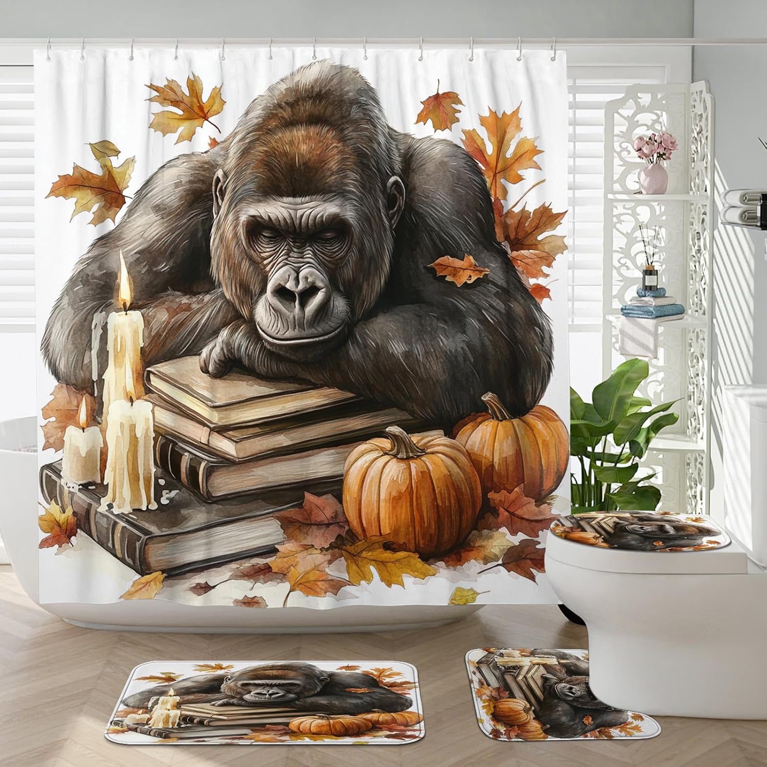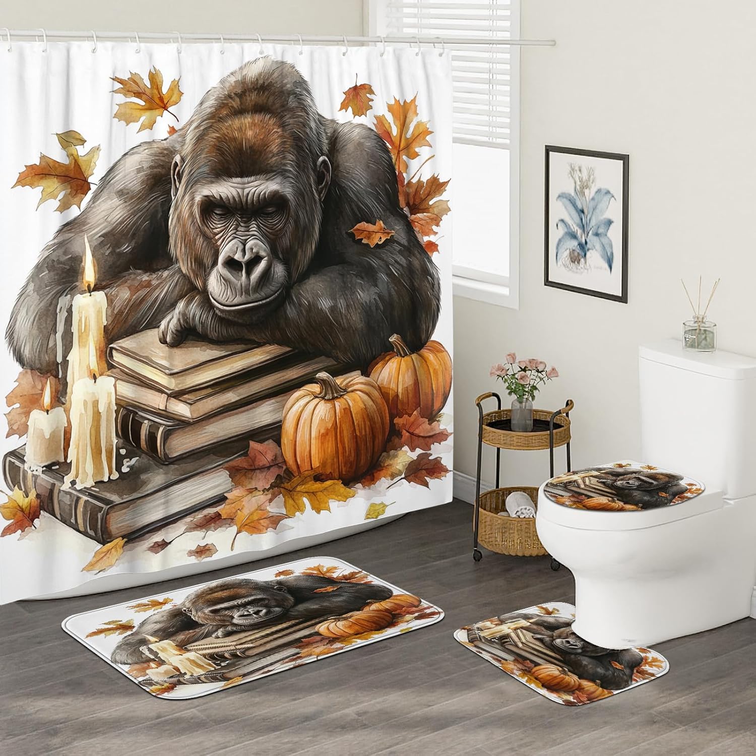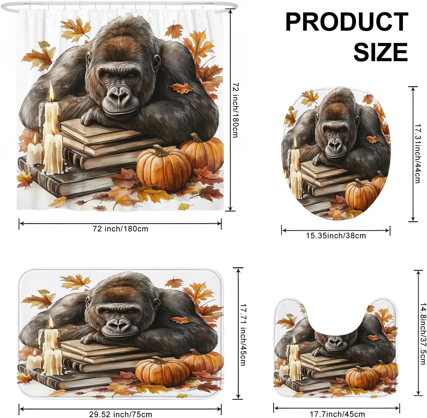 This 4-piece bathroom set is designed to bring warmth and a touch of autumn charm to your shower area. With a detailed fall chimpanzee pumpkin pattern on the shower curtain, it's printed using high-definition technology for vivid, fade-resistant colors that stay beautiful through time. Enhance both the aesthetics and functionality of your bathroom with the included non-slip rug, U shape, and toilet lid cover mat, offering practicality without compromising on style. Whether you're starting your day or winding down after a long day, this set creates a welcoming atmosphere that makes every routine more enjoyable.