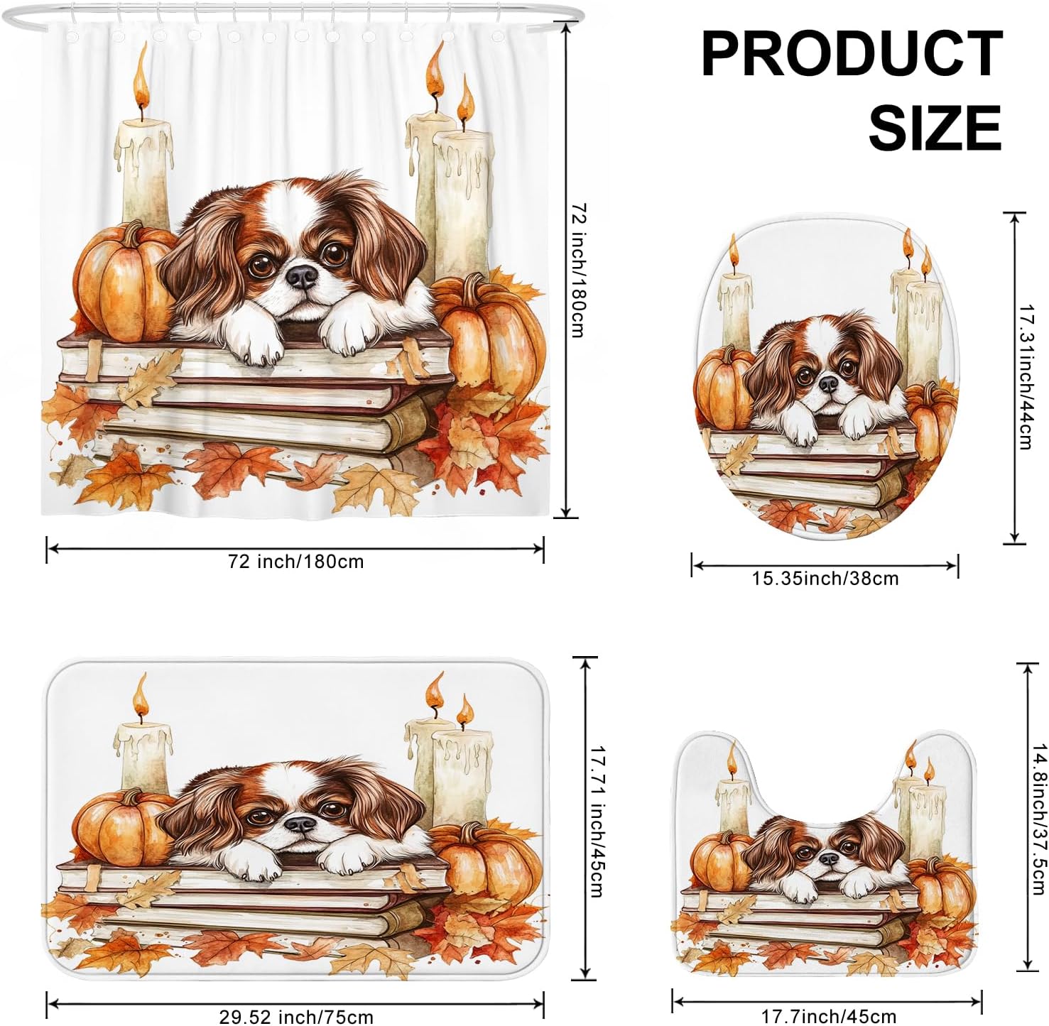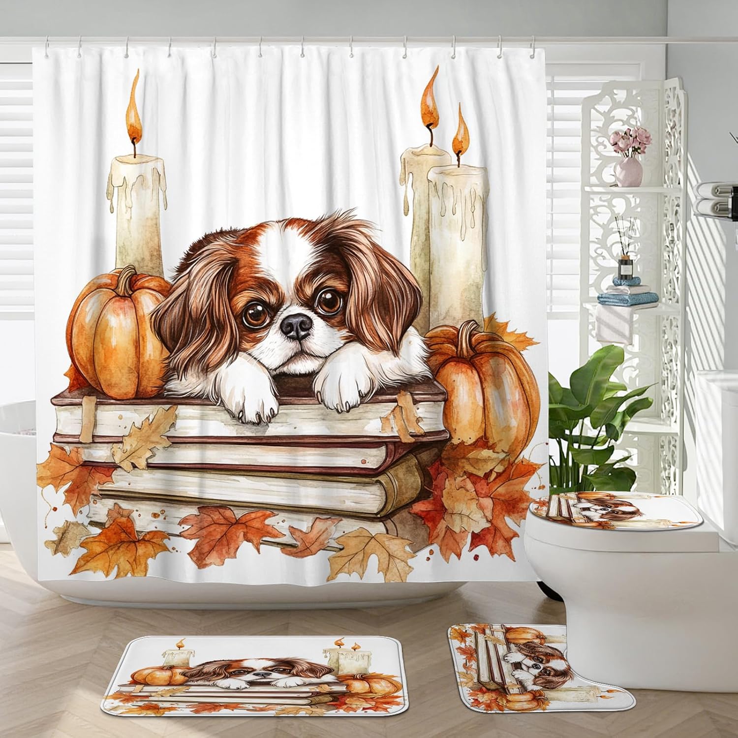 Elevate your bathroom with the DESIHOM 4PCS Fall Japanese Chin Dog Shower Curtain Set. This elegant collection blends style and practicality to bring a warm, inviting atmosphere to your daily routine. The set features a beautifully designed shower curtain, a non-slip rug, a U-shaped floor mat, and a toilet lid cover, all made from premium materials for long-lasting durability.