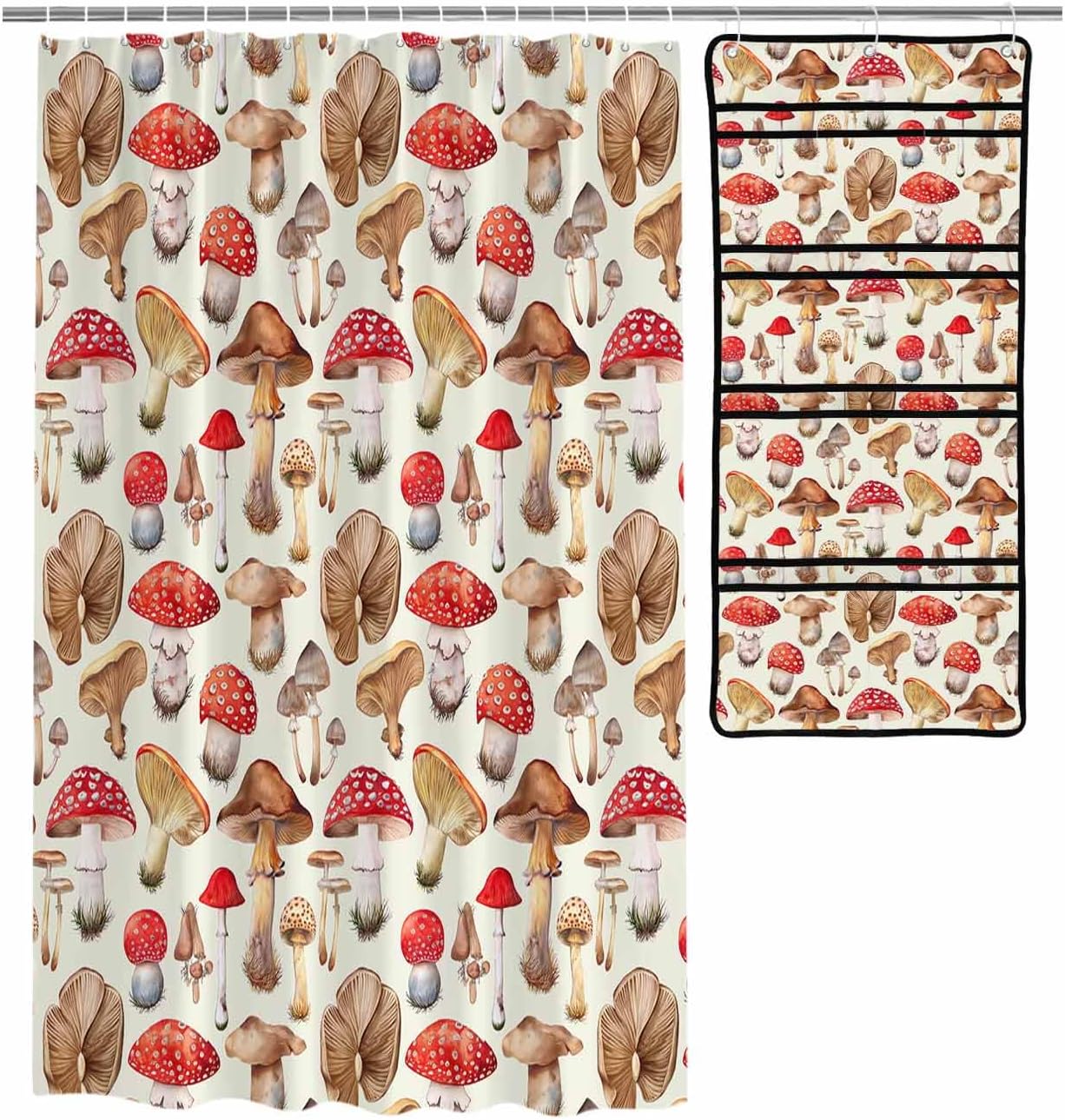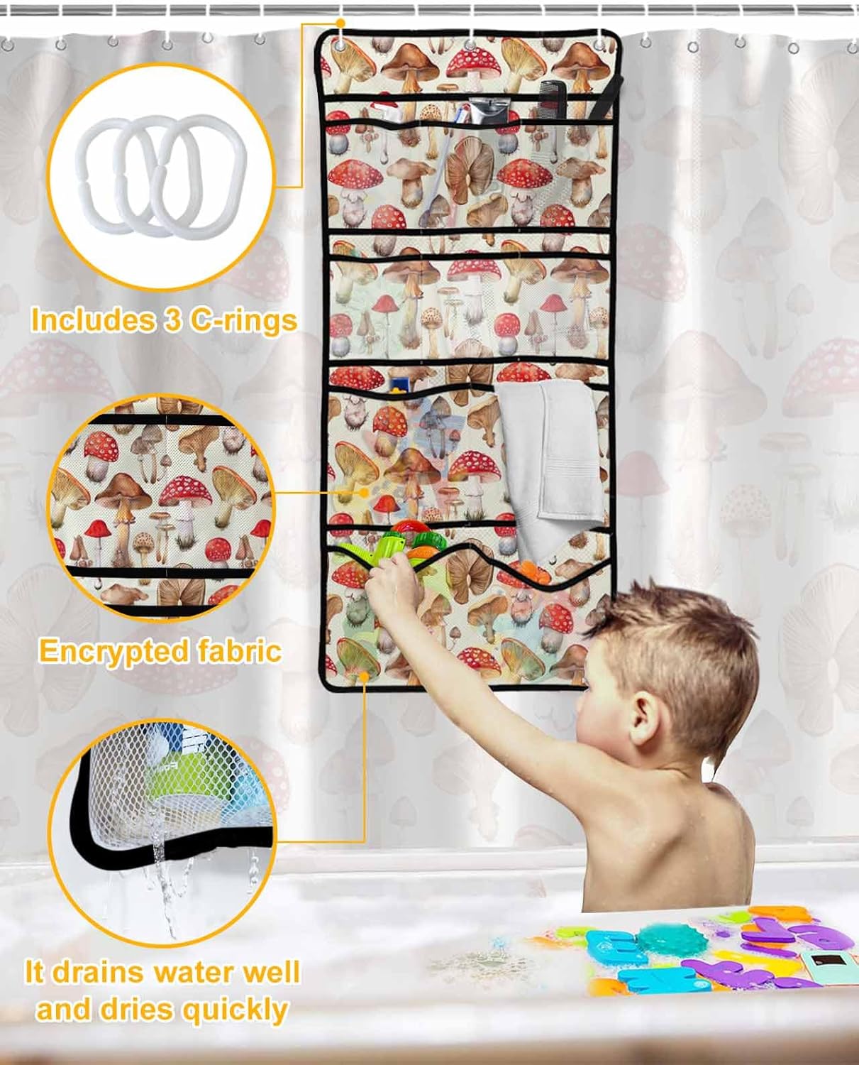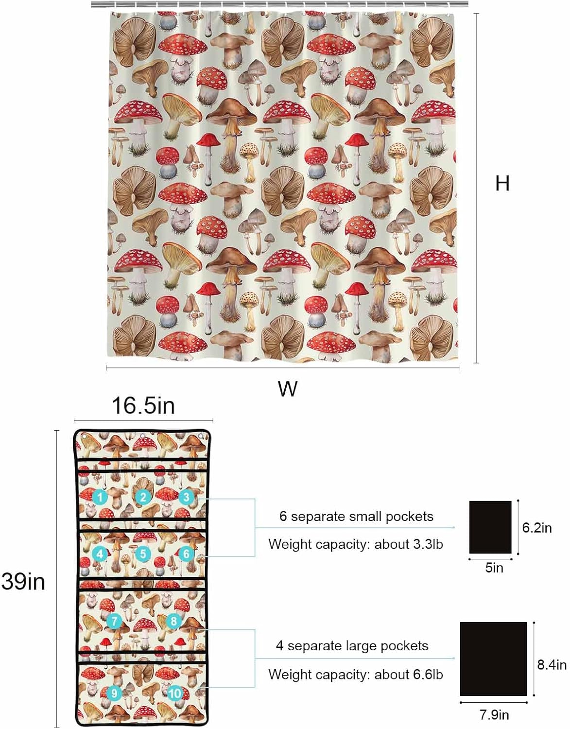 This durable and waterproof polyester shower curtain is the perfect size for standard shower rods, measuring 36\"x78\". It's not just about keeping your shower area dry and clean, but also about making your bathroom more inviting and visually appealing. The integrated mesh hanging organizer is equipped with 10 pockets in various sizesâsix small and four largeâto store all your essentials with ease, whether it's shampoo, skincare products, towels, or even toys.